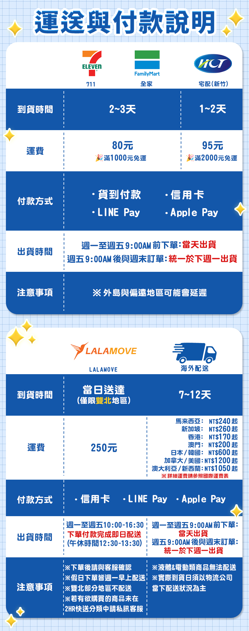 - 全家超商取貨:運費 NT$80,滿 NT$1000 免運。