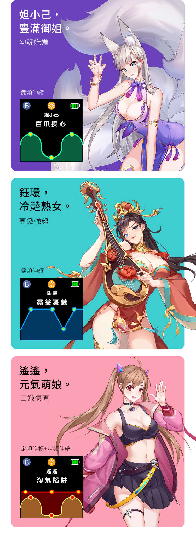 元系列飛機杯擁有三個IP內膽(熟女鈺環、禦姐妲小己、萌娘遙遙),通過不同的背景故事,打造了風格各異的人設。用戶不論是喜歡成熟知性還是傲嬌俏皮,都能得到滿足。