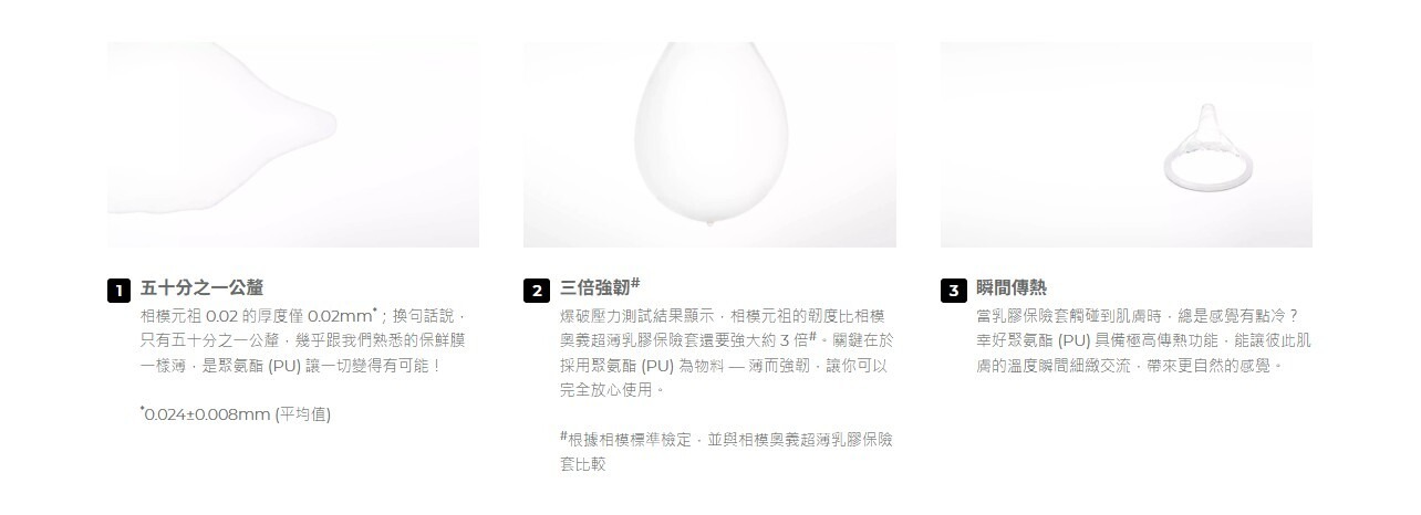 🧪 聚氨酯 (PU) 技術: 擁有比乳膠更強韌的特性,即使薄至 0.02mm 也能確保極高安全性。