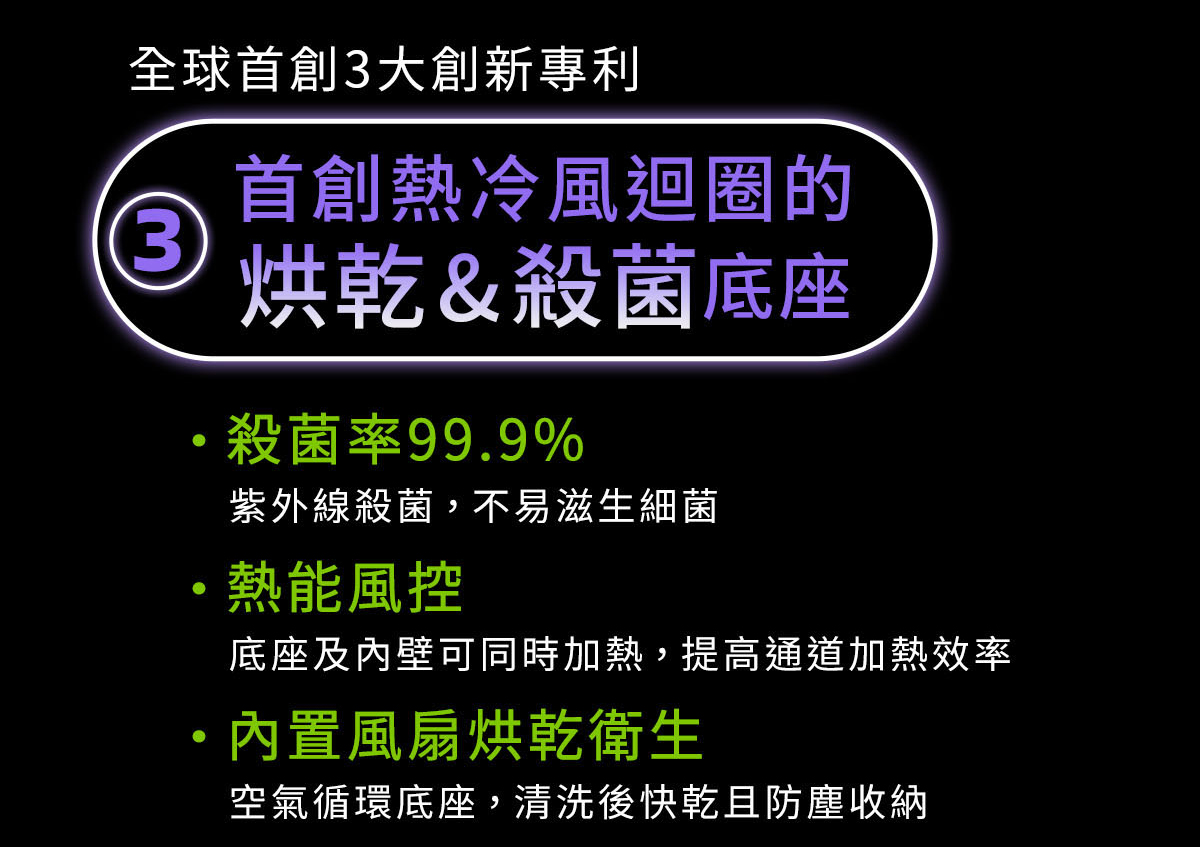 38.5度自動加熱,熱冷風 99.9%殺菌烘乾底座。