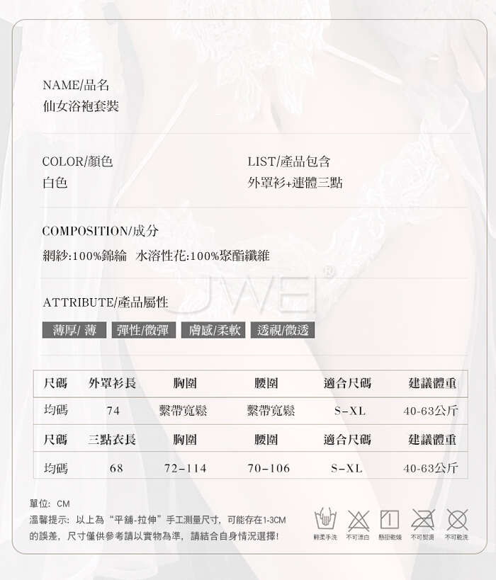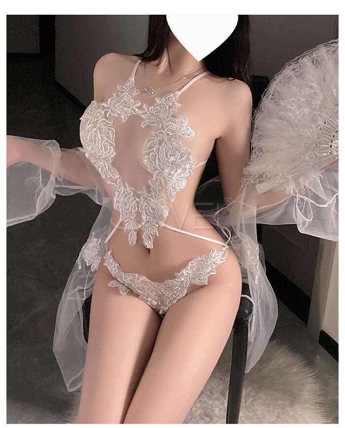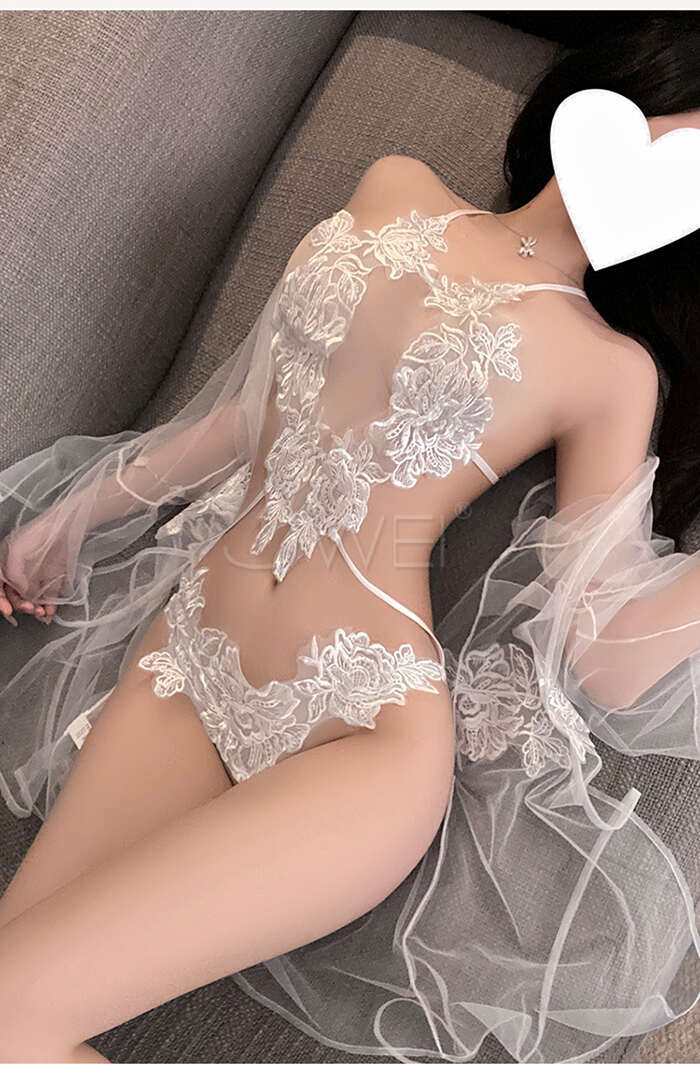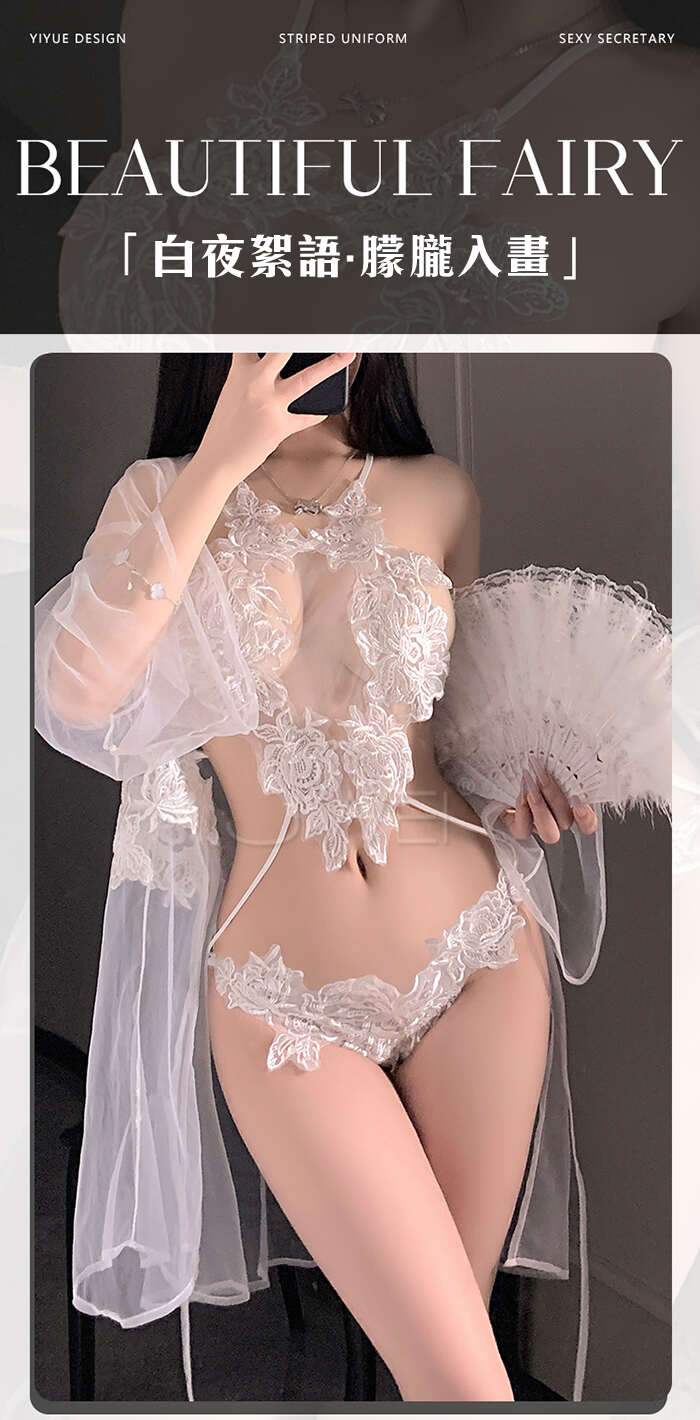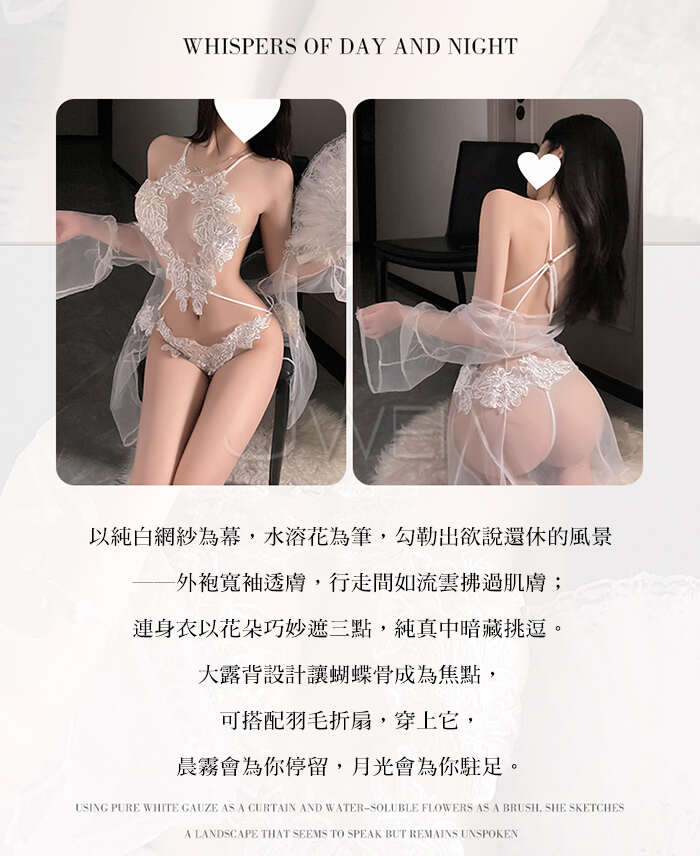 白夜絮語.純白網紗透膚水溶花蕾絲三點式連體衣【外罩衫+連體三點】