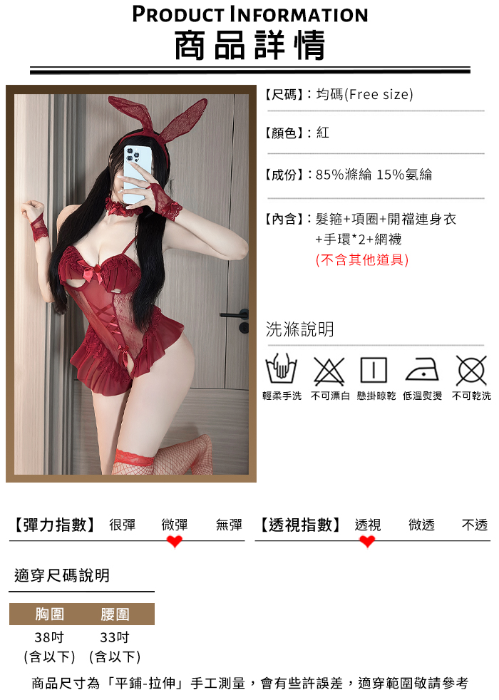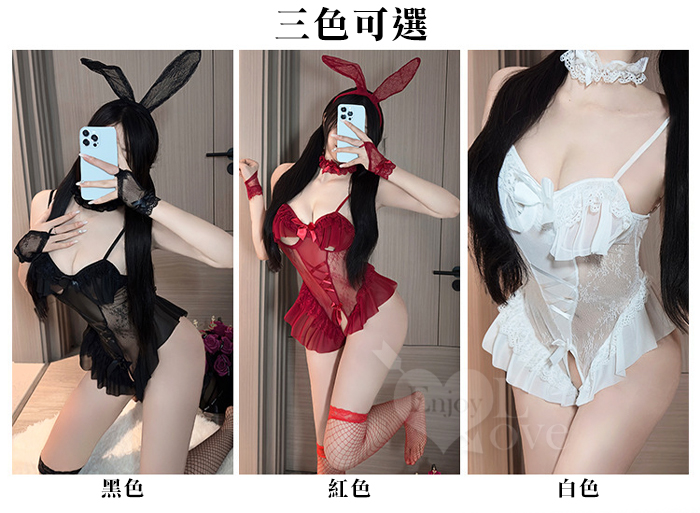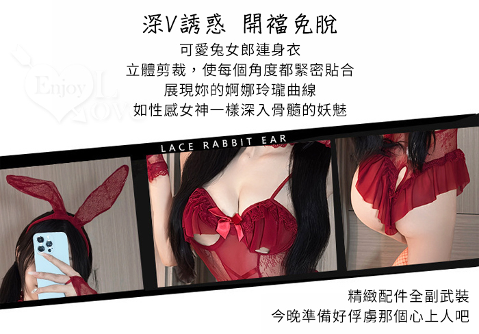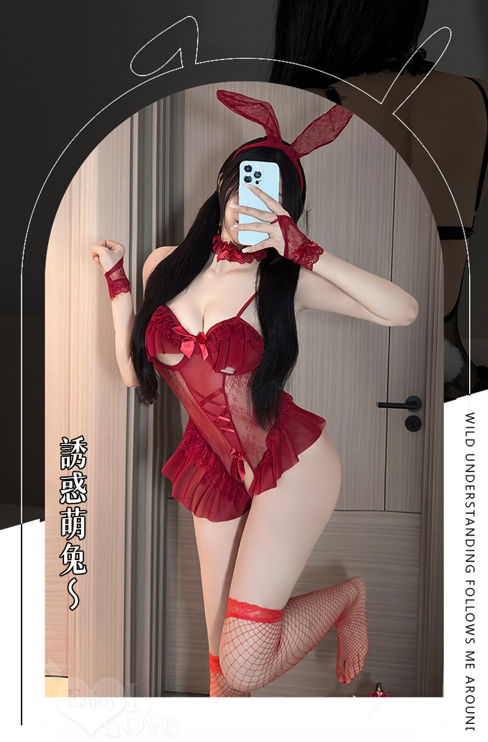 兔女郎角色扮演服!鏤空鋼圈露乳洞洞薄紗透視開襠連身衣五件式套装﹝紅﹞