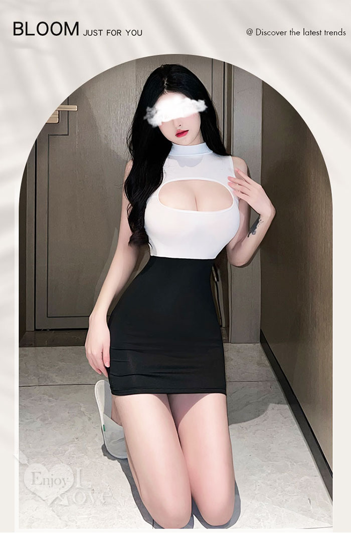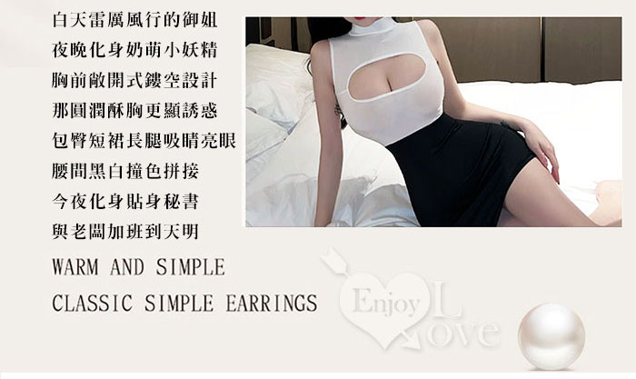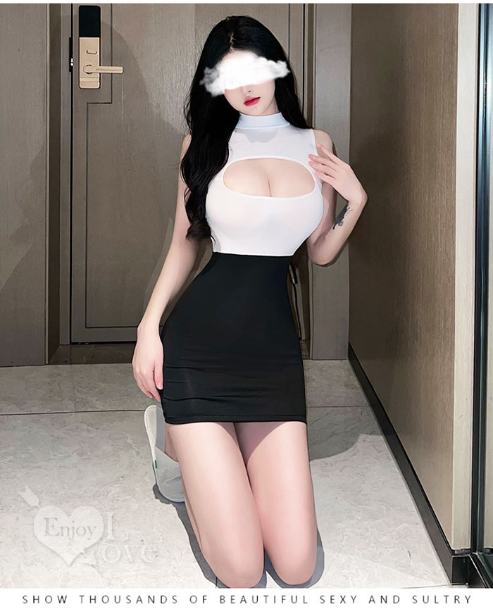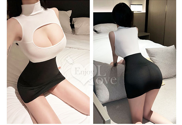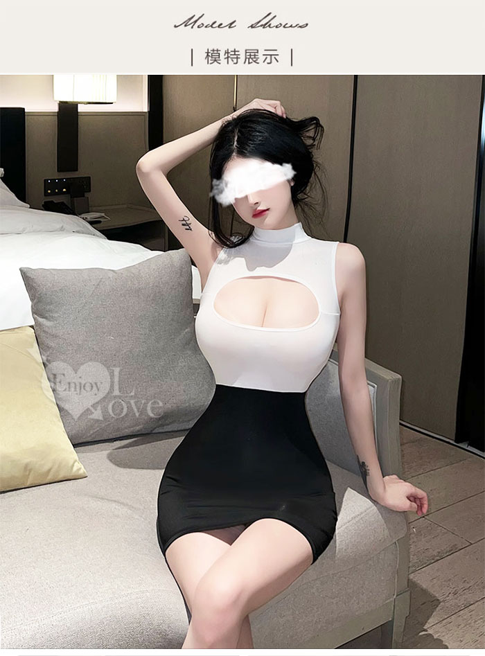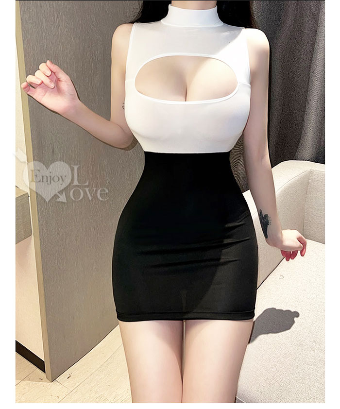 秘書角色扮演服!敞開式鏤空雪乳黑白撞色拼接包臀裙兩件組