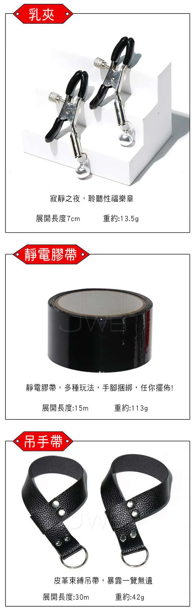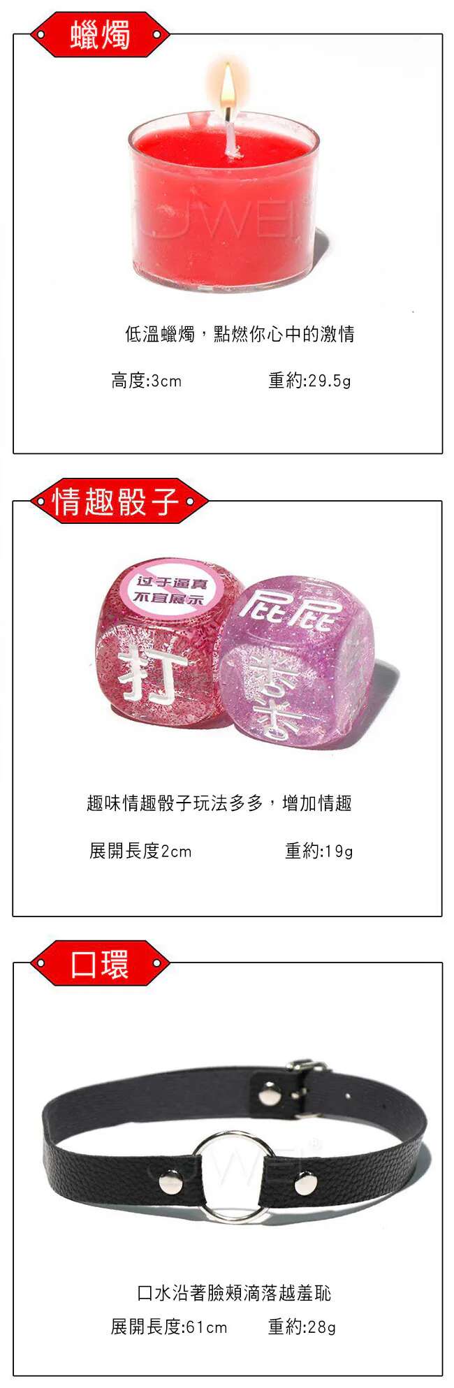 羽毛棒、捆綁繩、十字扣、皮鞭、乳夾、膠帶、吊手帶、蠟燭、骰子、口環