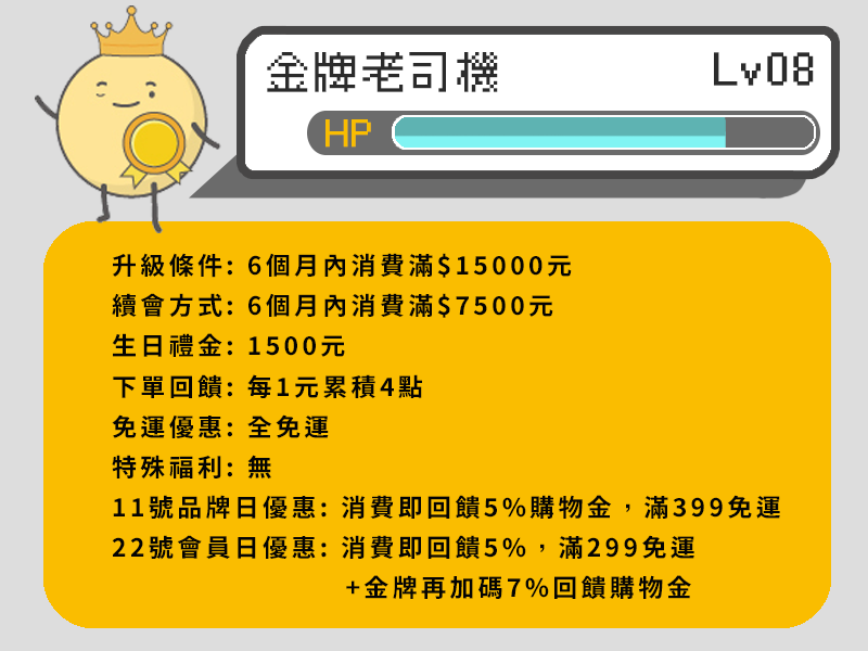 22號會員日優惠: 消費即回饋5%,再另外加碼金牌獨家7%回饋金