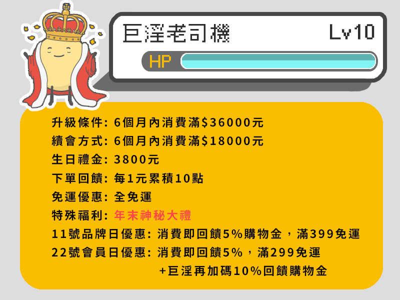 22號會員日優惠: 消費即回饋5%,再另外加碼巨淫獨家10%回饋金