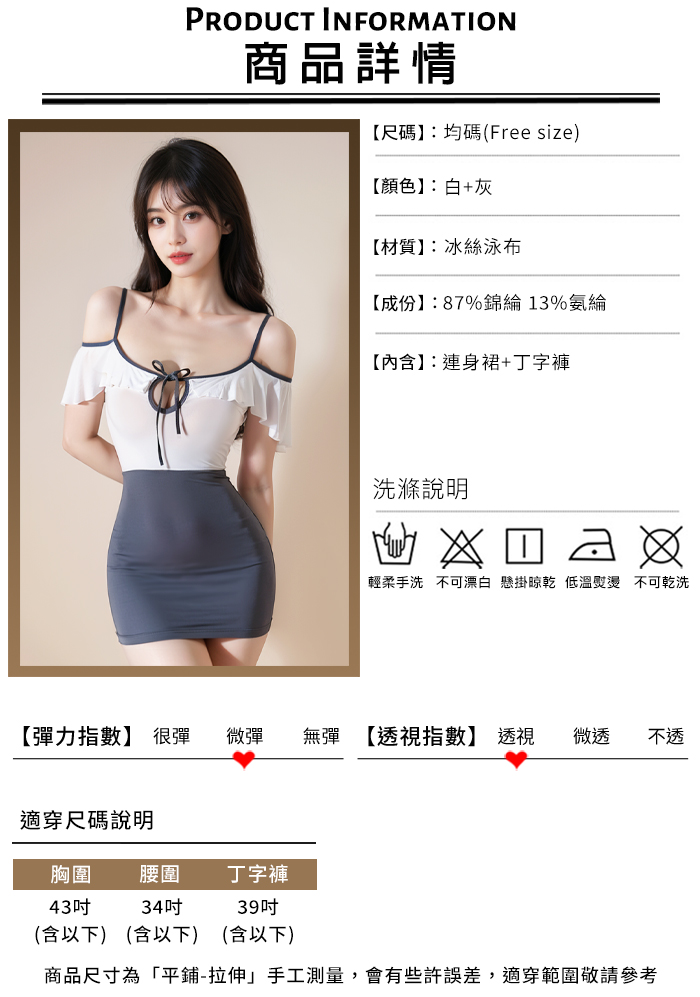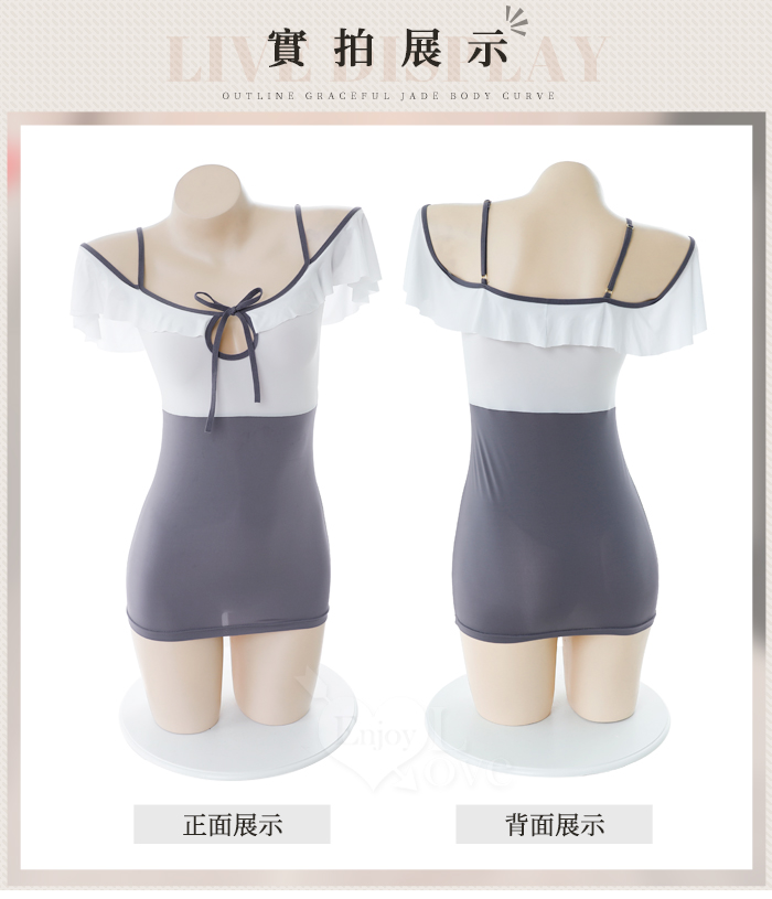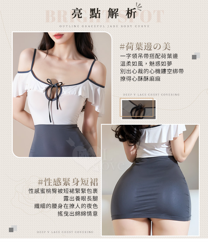 情趣睡衣!清純荷葉邊鏤空綁帶露肩包臀連身裙兩件組