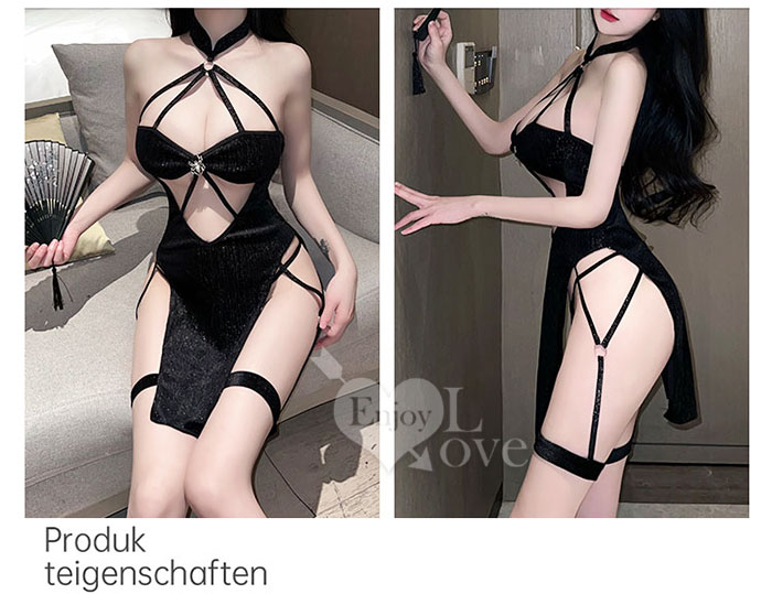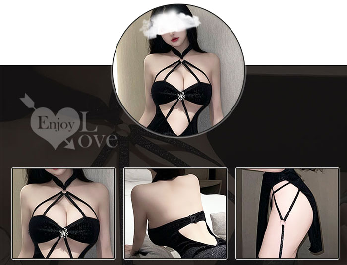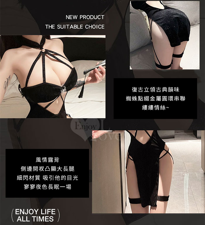 仿旗袍睡衣!絲絨亮面蜘蛛裝飾放射線條側邊高衩兩件組